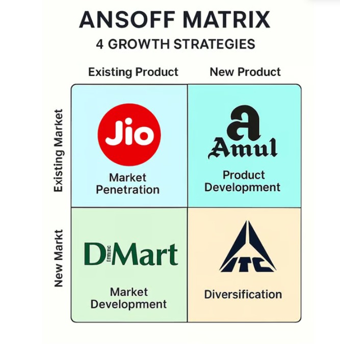 “Let’s understand the Ansoff Matrix through real-life Indian examples and see how different companies fit into each strategy.”