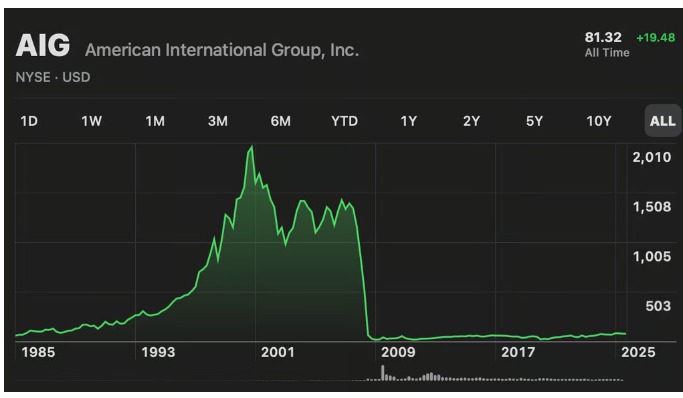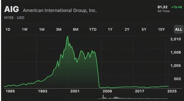 But equity holders? Their story was no different from Lehman’s. AIG’s stock price, once above $1,400 (split-adjusted), collapsed to under $0.35(all-time low) Currenty at ~$82(As on 1st Sep,2025). Shareholders bore the cost of survival, even as the institution was rescued.
